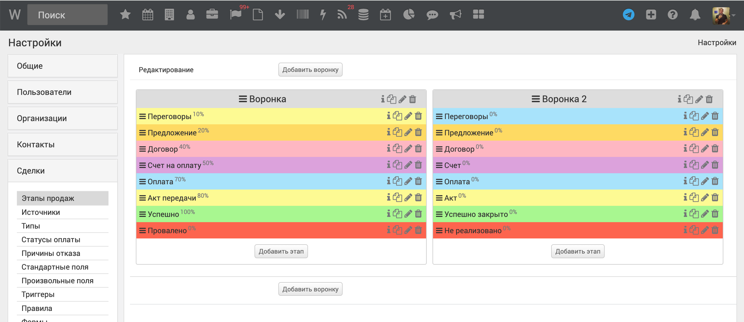 Пройдите в настройки этапов продаж https://secure.wirecrm.com/settings/deals/stages.