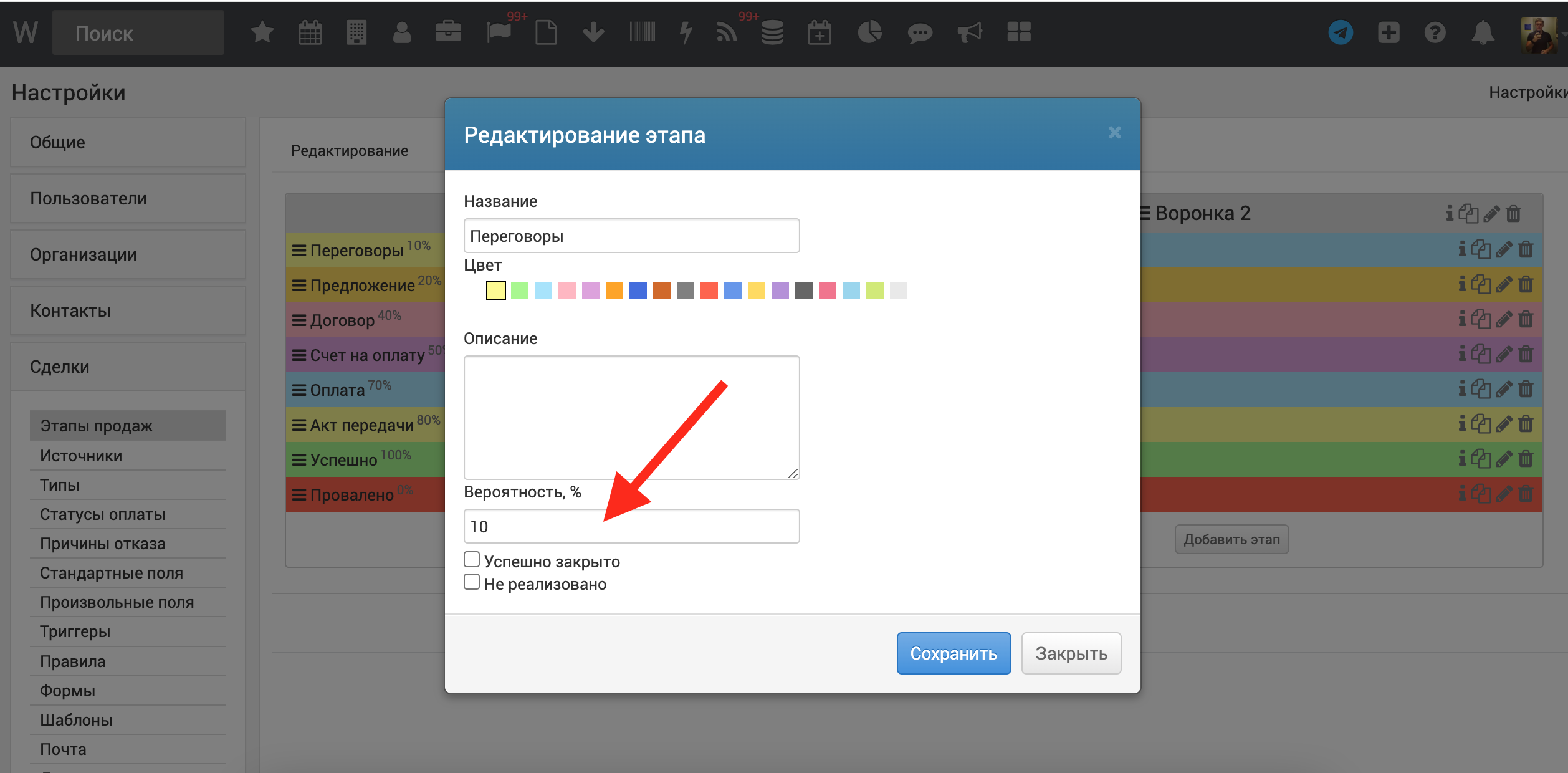 Укажите у этапов продаж в поле Вероятность значение процента по умолчанию. Например, Переговоры 10, Успешно закрыто 100.