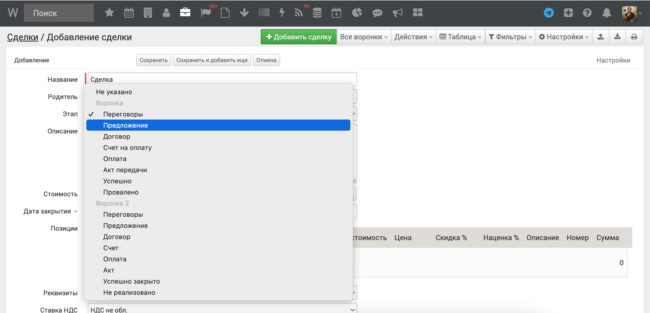 После этого откройте форму добавления сделки и выберите Этап Переговоры,