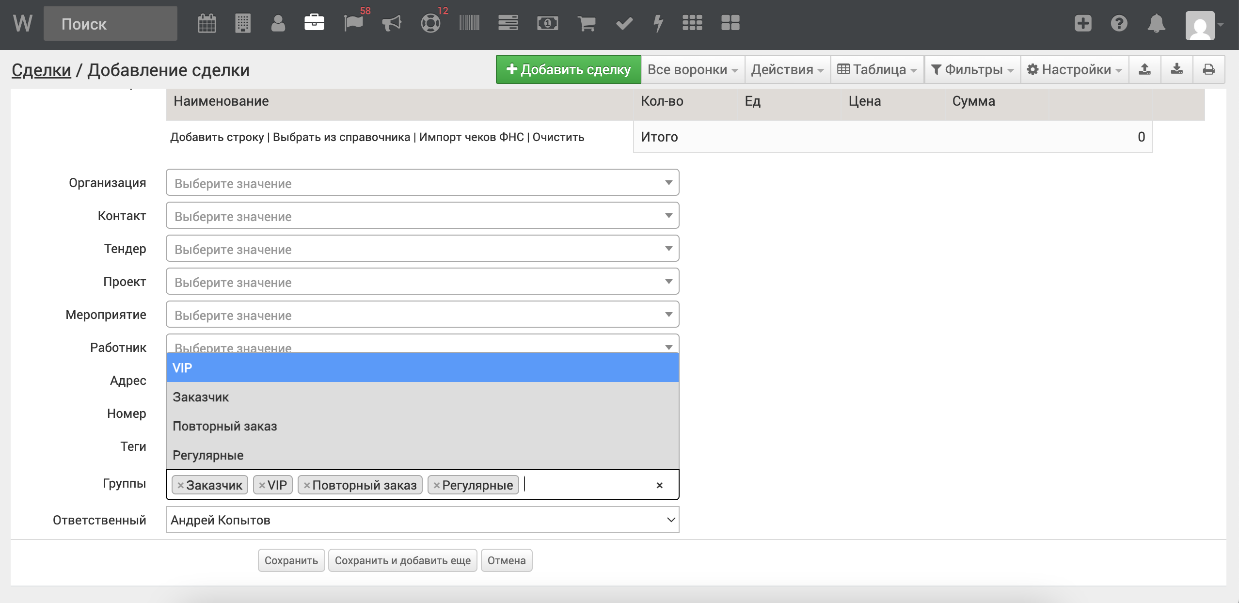 Мы добавили новое поле Группы прямо в формы создания и редактирования контактов, сделок, компаний и других элементов.
