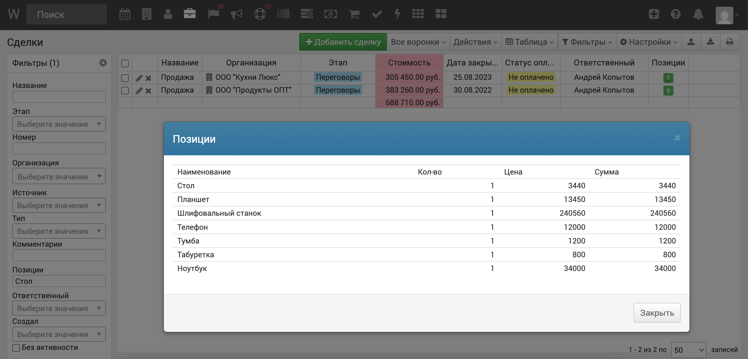Добавлен новый фильтр по товарам и услугам в сделках. Теперь вы можете быстро находить все сделки, содержащие определённые позиции. Для этого просто введите название товара или услуги в фильтр Позиции — система моментально отобразит все соответствующие сделки, заказы или другой объект поддерживающий позиции.