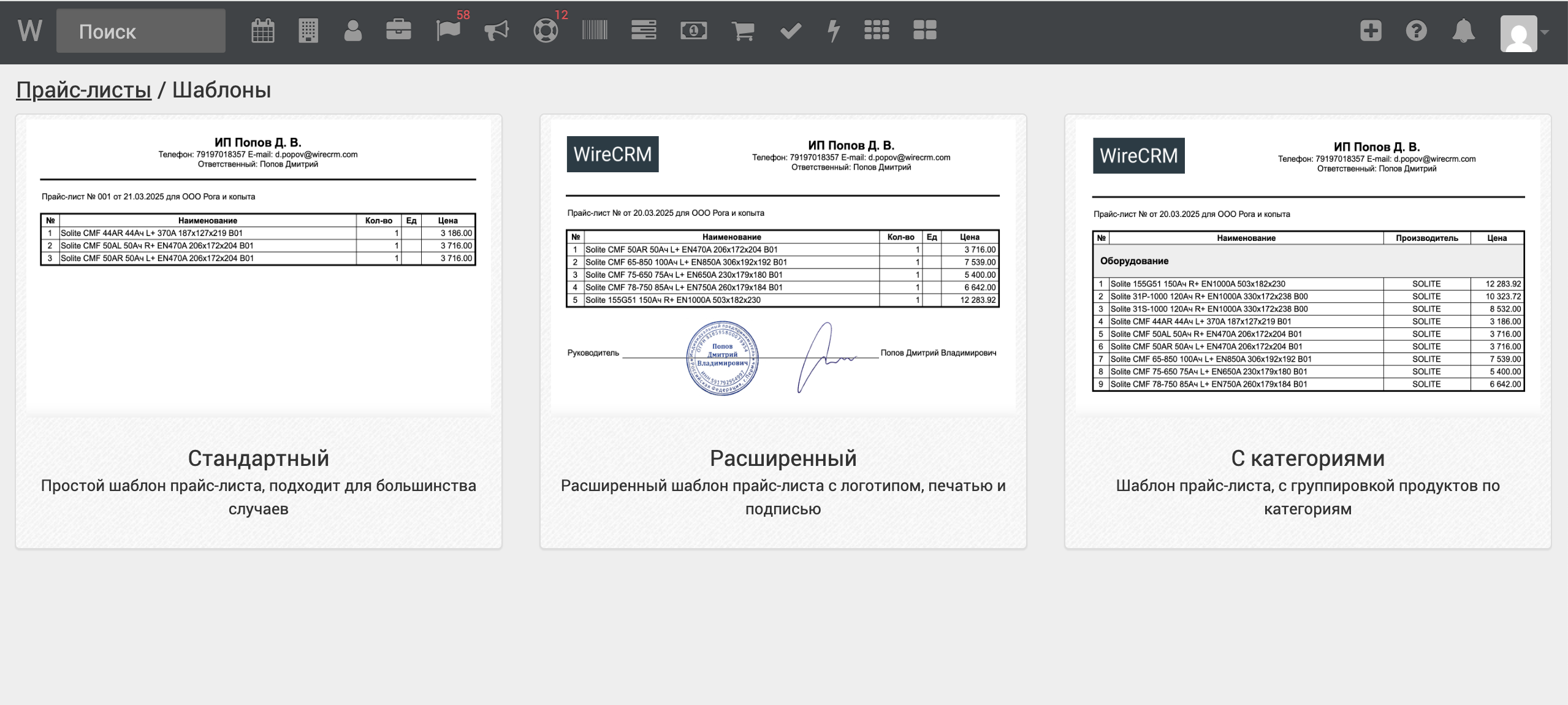 - Создавать неограниченное количество прайс-листов с указанием названия, номера, даты и состава позиций;